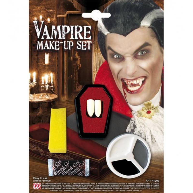 Set Trucco Vampiro (2 Canini In Vaschetta Bara. Adesivo Termoplastico In Granuli 1.4 G. Gel Sangue 3 Ml. Make Up In 3 Colori 4.5 Ml. Spugnetta)