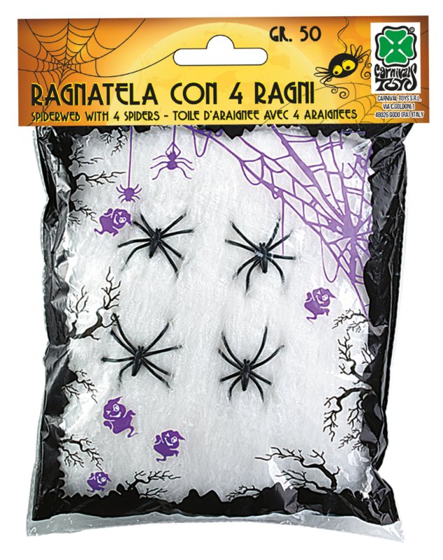 Ragnatela Bianca Con 4 Ragni Gr.50 Ca. In Busta C/cav. di Carnival-toys cod. 06460